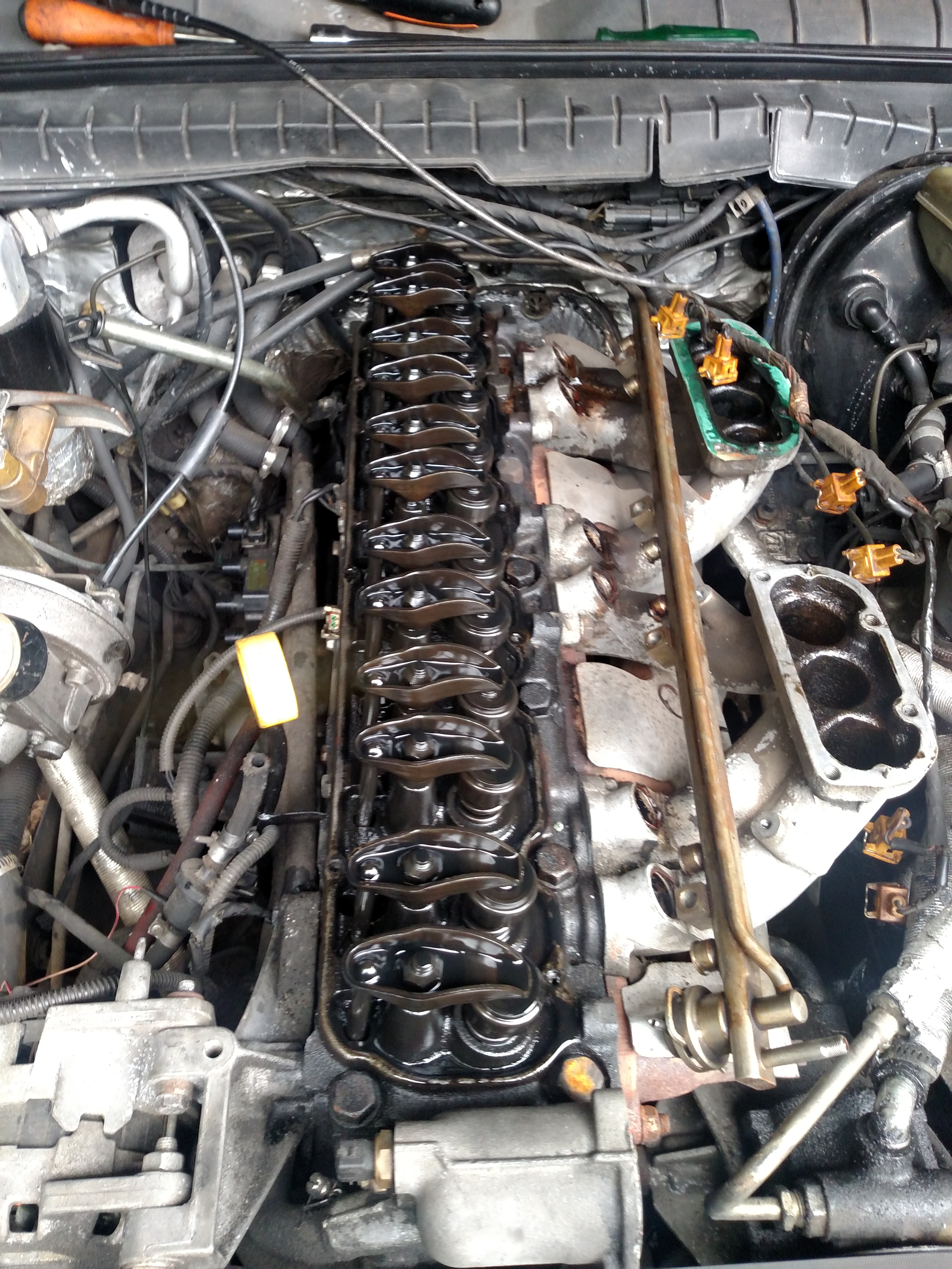 Logo na sequência deste desmonte, fomos para o cabeçote, afinal eu tinha que verificar o real problema do carro. Com a ajuda do Marcelo Lisboa (o mestre daqui se tratando de mecânica), do Luis Ely e um outro amigo, removemos o cabeçote e fiquei bem feliz em ver que o problema (como se já não houvessem muitos) realmente estava na junta do cabeçote, queimada entre o segundo e terceiro cilindro.