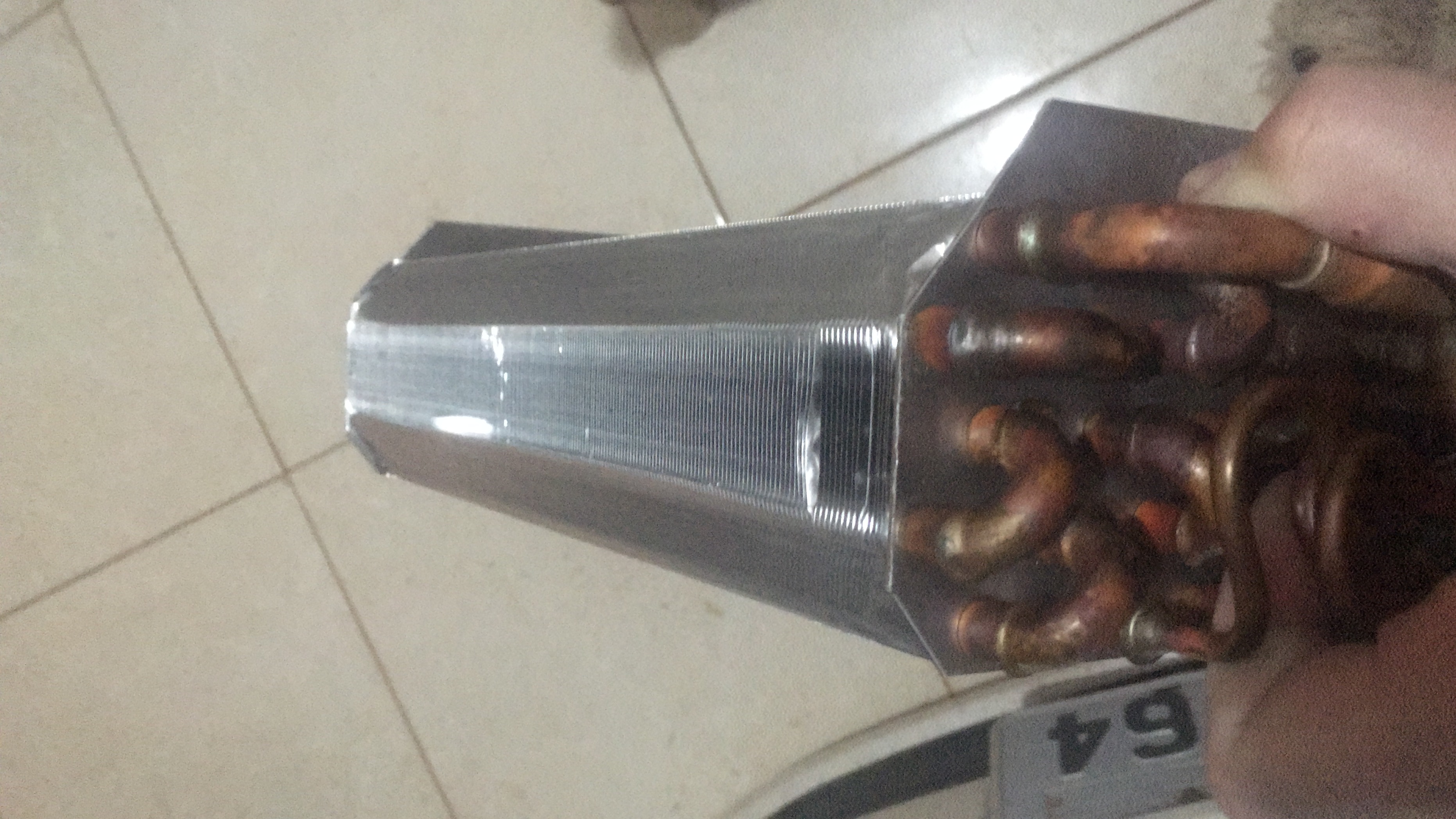 Lá na prateleira achei um único evaporador, e era de cobre. Comprei regateando o preço, já que estava muito feio. Depois que eu lavei, descobri que estava mais feio ainda.